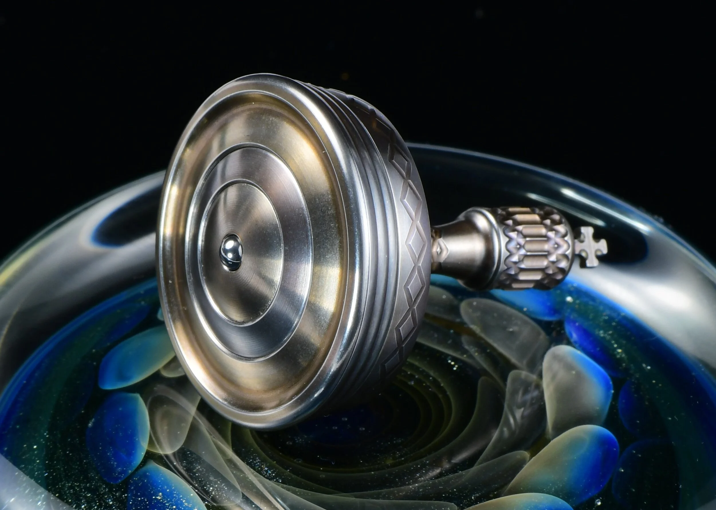 Designed after the King chess piece, The King Top brings elegance to the top world. Purple and blue electroanodized Timascus body seen in the bottom outer ring and the cross on the face, Zirc cover, electroanodized Titanium ring, Zirc stem with an electroanodized Titanium grip.